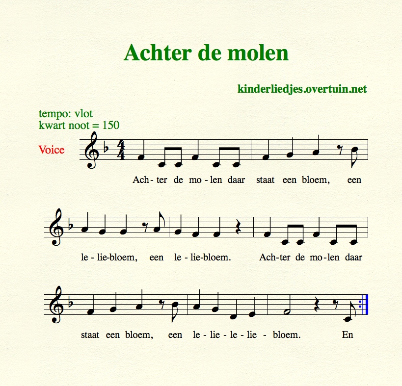 Inhoud pagina: Kinderliedjes met muziek en bladmuziek A - Nederlandse kinderliedjes met tekst, teksten, midi en mp3 - abcdefg, achter de molen, advocaatje ging op reis, af en toe gaan pa en moe met ons naar de speeltuin toe, alle eendjes zwemmen in het water, alles blij maakt de mei, als de grote klokke luidt, reuze, als hier een pot met bonen staat, altijd is kortjakje ziek, amsterdam die grote stad, arabine koeterine, 's avonds als het kampvuur brandt, kinderliedje