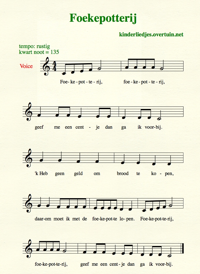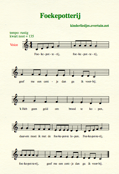 Inhoud pagina: Kinderliedjes met muziek en bladmuziek F-G - Nederlandse kinderliedjes met tekst, teksten, midi en mp3 - faya sitong no brong mi so, fivolala, vifolala, fifolala, foekepotterij geef me een centje, goedenavond speelman mijn vader laat vragen, grote klokken zeggen bim bam, kinderliedje