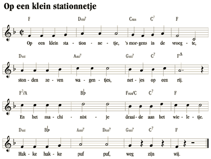 De melodie is gelijk aan het kinderliedje 'Op een klein stationnetje' (liedje hieronder).
