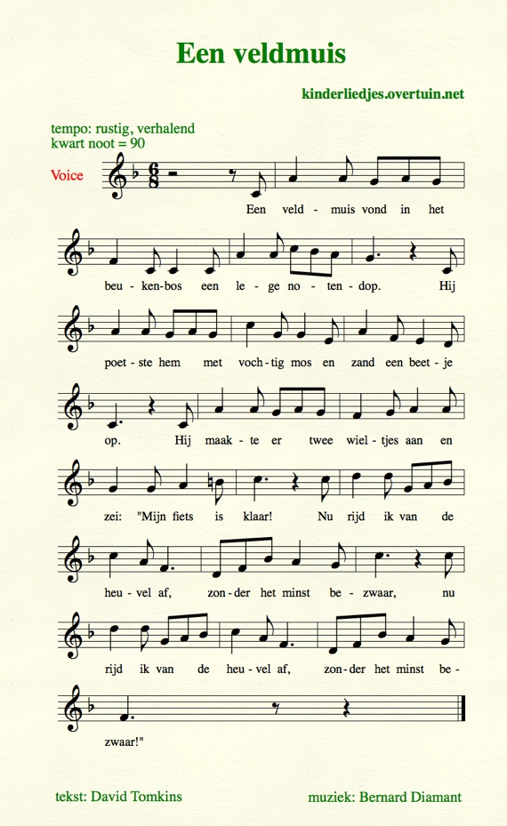 Nederlands kinderliedje met tekstdichter, tekst, muziek.