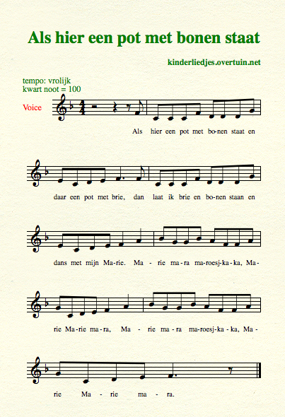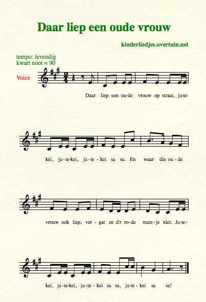 Inhoud pagina: Oude kinderliedjes uit grootmoeders tijd A-D - bekende, traditionele, Nederlandse kinderliedjes van vroeger - oud-hollandse kinderliedjes - met tekst, teksten, muziek, bladmuziek, midi en mp3 - aan de oever van de snelle vliet, abc, de kat liep in de sneeuw, alles in de wind, schipperskind, als hier een pot met bonen staat, boven op de bergen, buiten in de biezen, hondje, daantje zou naar school toe gaan, daar liep een oude vrouw op straat, jutekei, dans l'eau bleue, droomde gisteren van een ventje, gist'ren, duifje met je blanke veren, kinderliedje