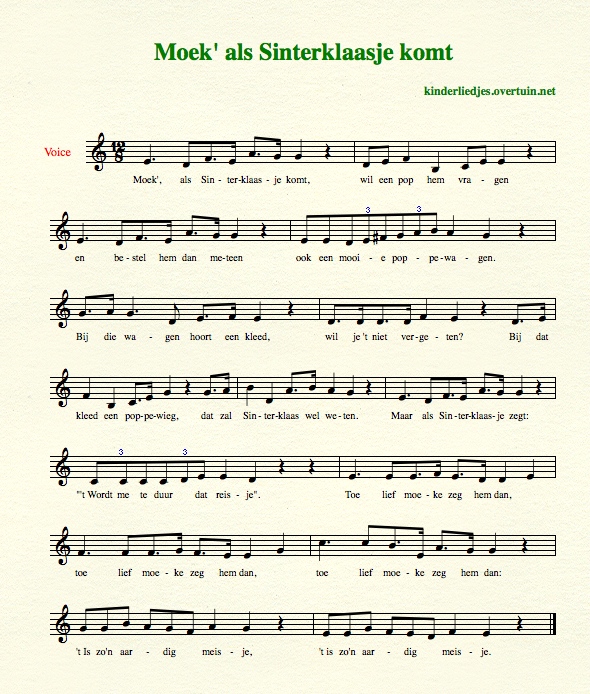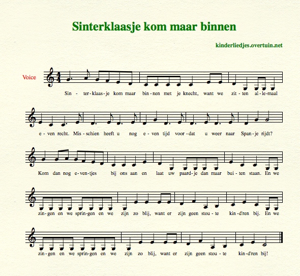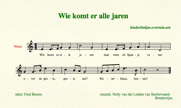 Inhoud pagina: 35 Sinterklaasliedjes met muziek en bladmuziek - alle liedjes sinterklaas - tekst teksten sinterklaasliedje zingen, luisteren, beluisteren, downloaden, online, meezingen, zwarte piet, sinterklaasliederen, midi mp3 - aankomst sinterklaas, Wie komt er alle jaren, aankomst sinterklaas, Wie komt er alle jaren, hij komt die lieve goede Sint, Sinterklaas goed heiligman, goedheiligman, zie ginds komt de stoomboot uit Spanje, daar is een stoomboot aangekomen, jongens heb je 't al vernomen, schoen zetten, sinterklaas is jarig, bij de kachel een schoentje, sinterklaas kapoentje, sinterklaasje bonne bonne, sinterklaas die goede heer, zachtjes gaan de paardevoetjes, paard, op de hoge hoge daken, bisschop, o kom er eens kijken, schoentje, och moeke hoor eens even, sinterklaastijd, vijf december ha dat is de blijde dag, vijf december ja dat is een blijde dag, moek als sinterklaasje komt, pop, bokkewagen, bokkenwagen, de zak van Sinterklaas, sinterklaas zegt moe, sinterklaasavond, hoor de wind waait door de bomen, rommeldebommel, gestommel, zie de maan schijnt door de bomen, daar wordt aan de deur geklopt, hop we zitten nu rechtop, spanje, wees welkom vandaag in ons midden, sinterklaasje kom maar binnen met je knecht, goedenavond sinterklaasje, dank sinterklaasje, dag sinterklaasje, mijn zusje kreeg van sinterklaas, twee emmertjes, recente sinterklaasliedjes, nieuwe sinterklaasliedjes, welkom welkom sinterklaas, piet heeft gesnoept van de pepernoten, zwarte piet ging uit fietsen, zwarte piet wiedewiedewiet, zwarte zwarte piet, schrikken, sinterklaas heeft zorgen, beat, beat van piet, piet op het dak, storm, piet waait weg, sinterklaasliedje
